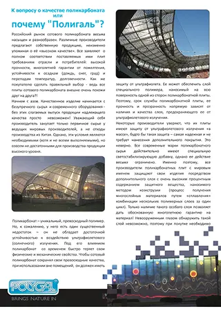 - Устойчивость к воздействию ультрафиолетовых лучей. Монолитный поликарбонат Полигаль имеет специальное покрытие, которое защищает его от вредного воздействия солнечных лучей.